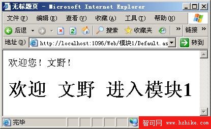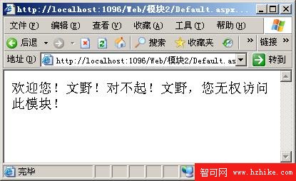 二、 假設有兩個用戶,一個“文野”,一個“stwyhm”,文野可以訪問模塊1,stwyhm可以訪問模塊2,當他們訪問各自有權訪問的模塊時,顯示模塊給出的歡迎詞,如果訪問的模塊沒有訪問權限,給出錯誤提示。其它用戶只能訪問指定模塊以後的頁面。
