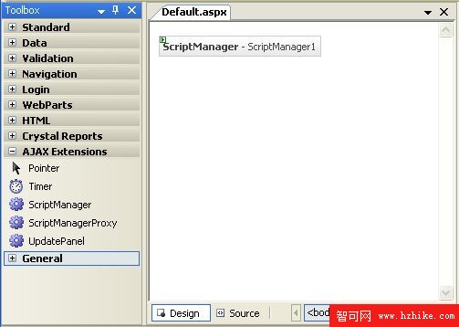 2.如果頁面沒有包含ScriptManager控件,在工具箱中的AJax Extensions標簽下雙擊ScriptManager控件添加到頁面中。