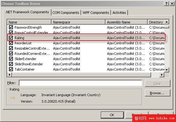 3. 注意,如果你在上述對話框中沒有找到有關AjaxControlToolkit的控件,則需要自己指定AJaxControlToolkit.dll程序集的路徑。讀者如果沒有找到該文件的話我這裡方便給大家提供一個下載。