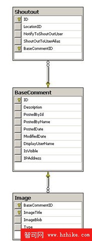 這是我所取的數據源中的三張數據表的結構關系圖,其中主表是Shoutout表,Shoutout中的一條記錄對應著多個Image,它們通過BaseComment表進行關聯。在下面我會給出如果獲取Shoutout分頁數據的存儲過程的代碼。