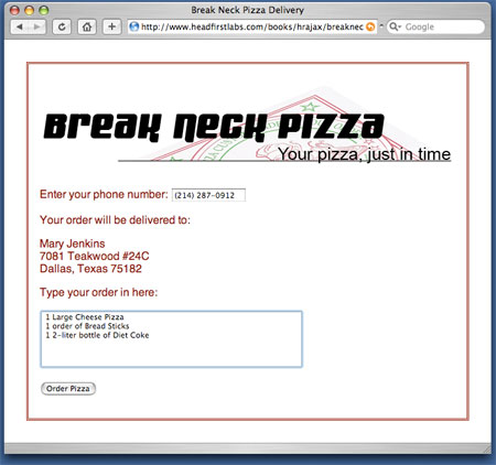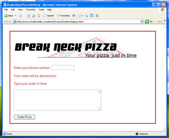 Ajax 采用一種沙箱安全模型。因此,AJax 代碼(具體來說就是 XMLHttpRequest 對象)只能對所在的同一個域發送請求。以後的文章中將進一步介紹安全和 Ajax,現在只要知道在本地機器上運行的代碼只能對本地機器上的服務器端腳本發送請求。如果讓 AJax 代碼在 www.breakneckpizza.com 上運行,則必須 www.breakneck.com 中運行的腳本發送請求。
