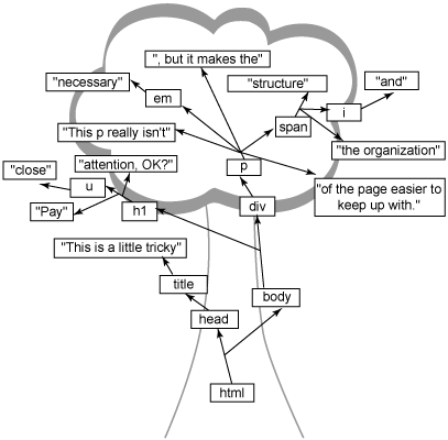 只要牢記您的標記只為您的頁面提供組織、框架,您就能立於不敗之地。再前進一小步,您就會明白浏覽器是如何接受所有的文本組織並將其轉變為超級有趣的一些東西的,即一組對象,其中每個對象都可被更改、添加或刪除。