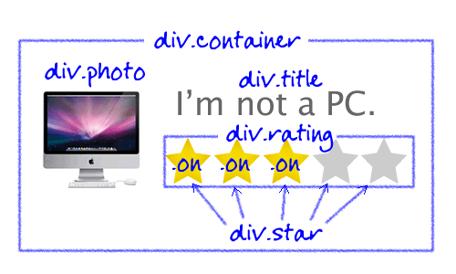 好,讓我們從示例開始。在上面提到的網頁中,當一個star被點擊時,我們需要給它以及左邊的每個star添加class“on”。與此同時,我們要改變所有star父元素的背景顏色,因此,我們的代碼如下:
