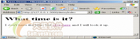 Rails有若干幫助者方法以在你的視圖的模板中實現Ajax。一種最簡單且很通用的方法就是link_to_remote()。讓我們考察一個簡單的web頁面-它實現詢問時間並且有一個鏈接,用戶可以點擊這個鏈接來獲得當前的時間。該應用程序經由link_to_remote()使用AJax以檢索時間並且顯示它於web頁面。