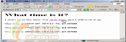 當用戶點擊"點擊這裡"鏈接時,浏覽器構建一個XMLHttpRequest對象,並把它發送到服務器-伴隨一個將調用say_when行動處理器的URL-它返回一個包含當前時間的Html響應片斷。客戶端JavaScript接收到該響應並且通過它來用一個time_div id替換<div>的內容。