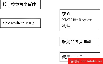 請看上面一個簡單的例子,通過他,我們能夠初步認識AJax架構的工作模式!本例子,只包含了一個DIV標籤,用來顯示最後的結果,以及一個”查詢”button.整個執行流程如下:
