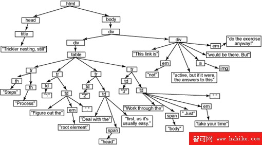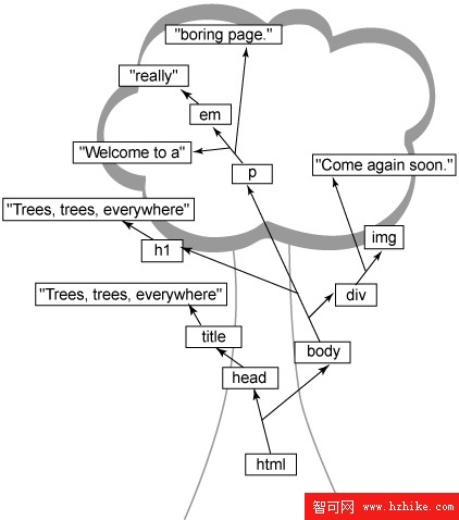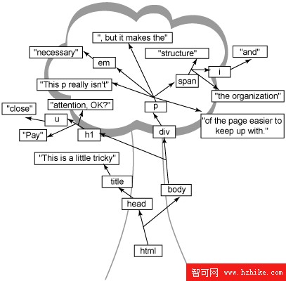 既然了解了一些基本的術語,現在應該關注一下其中包含元素名稱和文本的小矩形了(圖 1)。每個矩形是一個對象;浏覽器在其中解決一些文本問題。通過使用對象來表示 Html 文檔的每一部分,可以很容易地更改組織、應用樣式、允許 JavaScript 訪問文檔,等等。