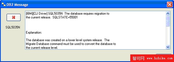 運行 DB2 Control Center,當訪問原來的數據庫 Sample 時,會彈出一個錯誤信息的對話框。提示該數據庫是被一個低版本的數據庫創建。因此必須把數據庫進行遷移。如圖 3 所示。下一節將講述如何遷移數據庫。