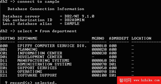 為驗證我們的數據庫被成功遷移到 DB2 V9,我們可以連接到數據庫 sample,並查詢其中的數據。我們試驗的結果如圖 4 所示。現在我們能夠成功的連接到數據庫 sample,並能夠查詢到其中的數據。