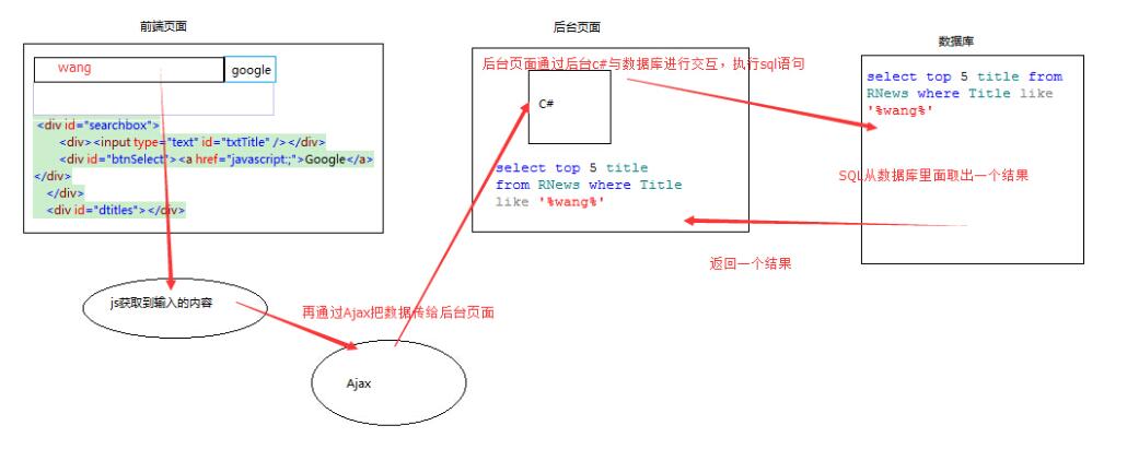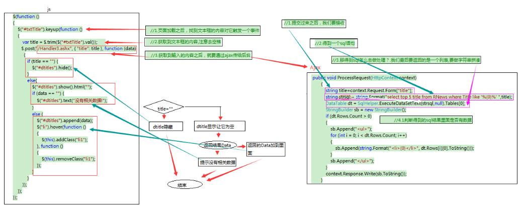 { //1.頁面加載之後,找到文本框的內容對它觸發一個事件 $("#txtTitle").keyup(function () { //2.獲取到文本框的內容,注意去空格 var title = $.trim($("#txtTitle").val()); //3.獲取到輸入的內容之後,就要通過ajax傳給後台 $.post("/Handler3.ashx", { "title": title }, function (data) { if (title == "") { $("#dtitles").hide(); } else { //顯示展示div,把它清空 $("#dtitles").show().html(""); if (data == "") { $("#dtitles").text("沒有相關數據!"); } else { $("#dtitles").append(data); //4.鼠標移上去之後,加一個背景 $("li").hover(function () { $(this).addClass("li1"); }, function () { $(this).removeClass("li1"); }); } } }); }); });