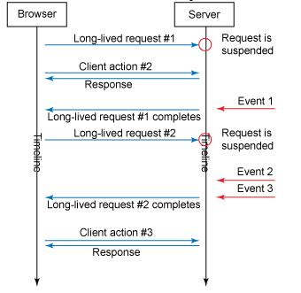 它的實現過程如下:頁面加載的時候隨即向服務器發送一條Ajax請求,服務器端獲取請求並將它保存在一個線程安全的容器中(通常為隊列)。同時服務器端仍然可以正常響應其他請求。當需要推送的事件到來的時候,服務器遍歷容器中的請求在返回應答後刪除。於是所有停留在頁面中的浏覽器都會獲得該應答,並再次發送Ajax請求,重復上述過程。