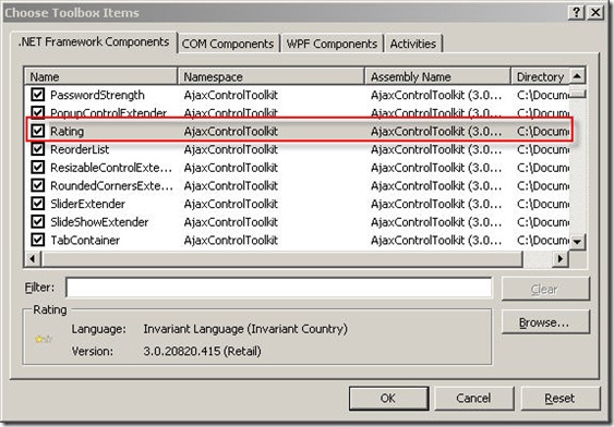 3. 注意,如果你在上述對話框中沒有找到有關AjaxControlToolkit的控件,則需要自己指定AjaxControlToolkit.dll程序集的路徑。讀者如果沒有找到該文件的話這裡方便給大家提供一個下載。