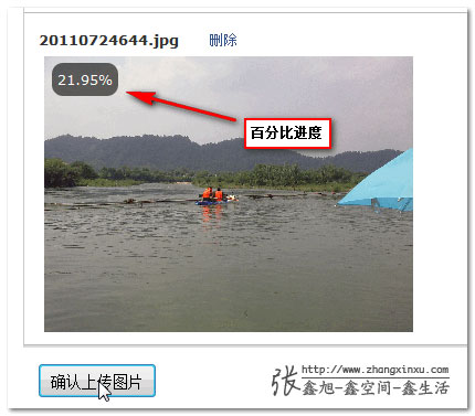 上傳中觸發的方法。本demo效果就是圖片左上角有個有著圓角黑色半透明背景元素,裡面的百分比值不斷增加。代碼: