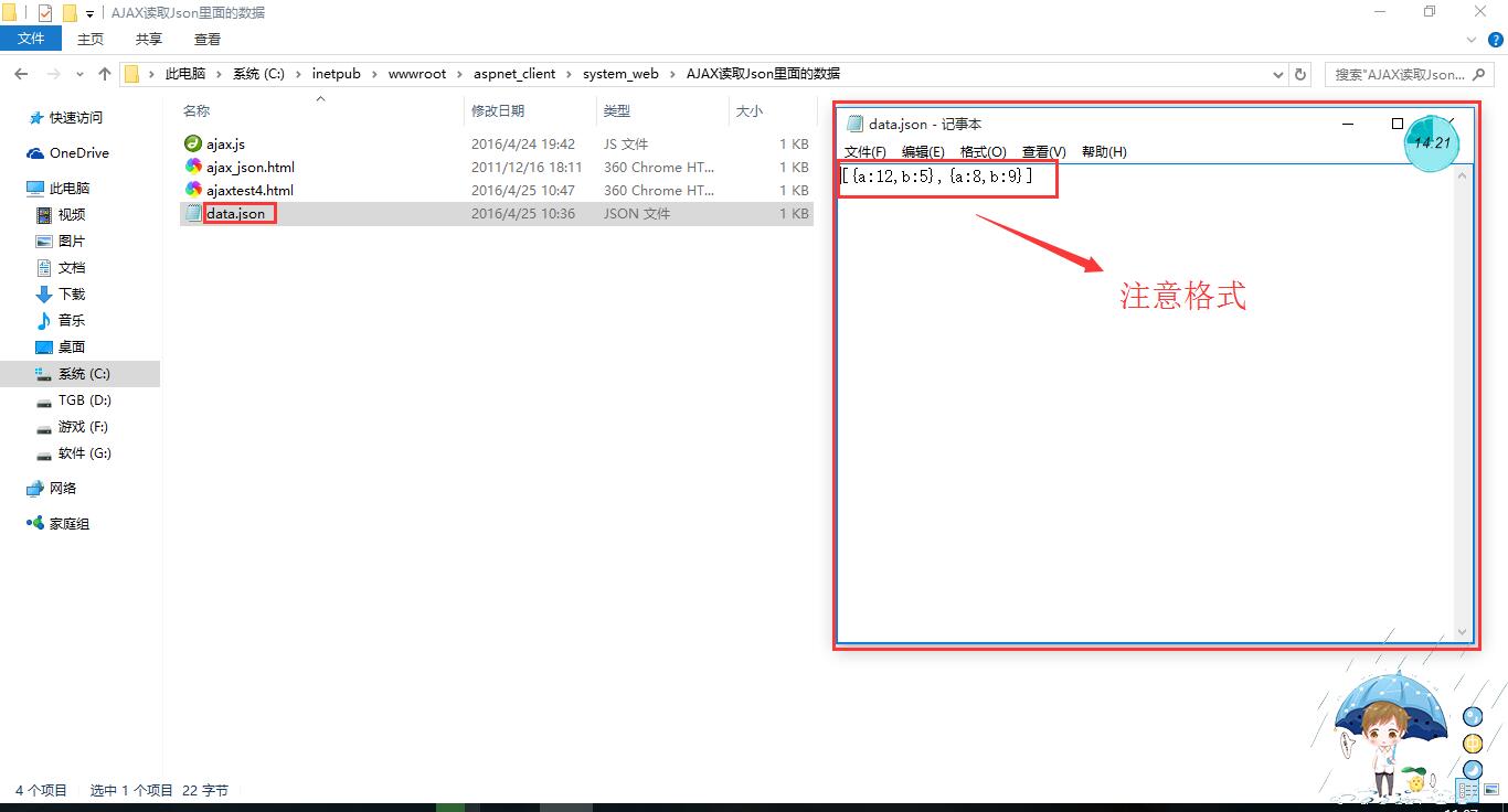 接下來就是要讀取出文件內容,在這之前,有一點要提的是,AJAX是從服務器上讀取文件,所以要把寫好的JSON文件放到服務器的路徑下,可能初學者接觸過的服務器只有IIS,他的文件路徑是C:\inetpub\wwwroot\aspnet_client\system_web,只要把Json放到這個路徑下,然後用localhost來訪問服務器,就可以了。