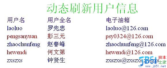 str.Append("<table style='text-align:left;color:red;width:600px'><tr style='color:#00FF00;font-size:40px;text-align:center'><td colspan='3'>動態刷新用戶信息</td></tr><tr style='color:#6600FF'><td style='text-align:left;width:100px'>用戶名</td><td style='text-align:left;width:200px'>用戶全名</td><td style='width:250px'>電子油箱</td></tr>");