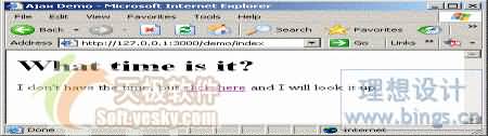 Rails有若干幫助者方法以在你的視圖的模板中實現Ajax。一種最簡單且很通用的方法就是link_to_remote()。讓我們考察一個簡單的web頁面-它實現詢問時間並且有一個鏈接,用戶可以點擊這個鏈接來獲得當前的時間。該應用程序經由link_to_remote()使用Ajax以檢索時間並且顯示它於web頁面。