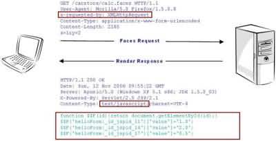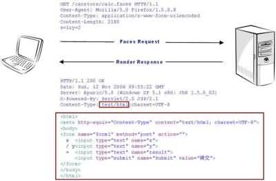 回顧一下常規JSF引擎針對請求與響應的過程:首先,客戶端請求某個資源,產生一個Faces Request;服務器端接收到此請求以後,經過一系列後台處理,產生一個Faces Response。我們注意到:響應的Content-Type是text/html,而產生的內容主體是一段HTML文本;浏覽器在接收到HTML文本以後,進行整個頁面的渲染與刷新。