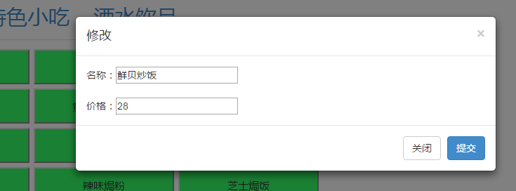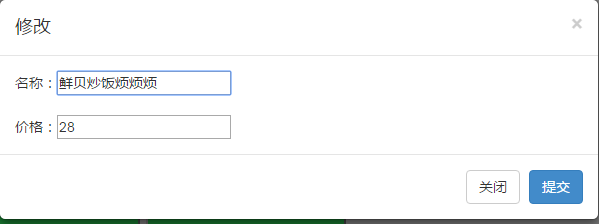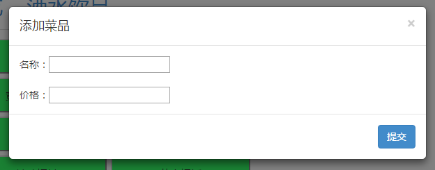 <div id="tianjia" data-toggle='modal' data-target='#myModall'>添加菜品</div> <div class="modal-content"> <div class="modal-header"> <button type="button" class="close" data-dismiss="modal" aria-hidden="true">×</button> <h4 class="modal-title" id="myModalLabel">添加菜品</h4> </div> <div class="modal-body" id="content"> <div id="name">名稱:<input type="text" id="ming"/></div> <br /> <div id="price">價格:<input type="text" id="jia"/></div> </div> <div class="modal-footer"> <button type="button" class="btn btn-primary" id="tijiao1">提交</button> </div> </div>