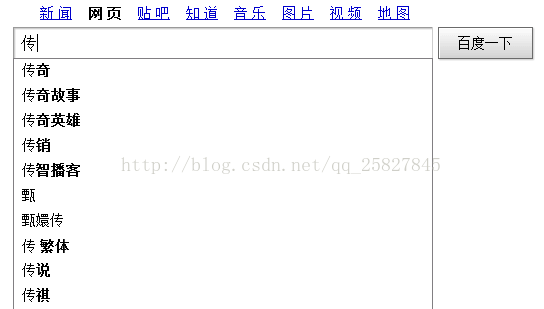 當我們在百度中輸入一個“傳”字後,會馬上出現一個下拉列表!列表中顯示的是包含“傳”字的10個關鍵字。