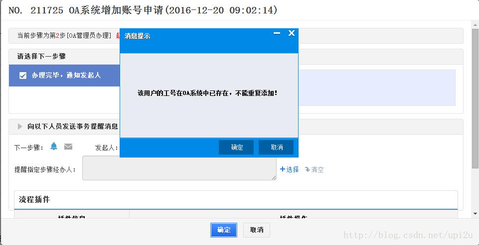 通過流程審批完畢後,流轉到OA管理員哪裡,管理員在進行下一步轉交時即在後台創建賬號,如果沒有錯誤則會提示創建成功,如果有錯誤也會進行提示。