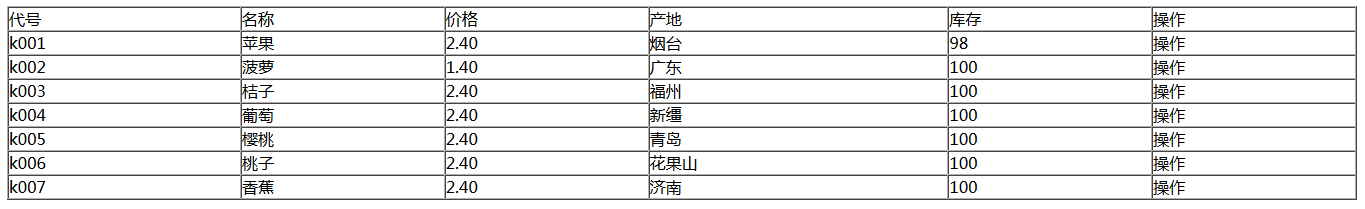 str += "<tr><td>"+lie[0]+"</td><td>"+lie[1]+"</td><td>"+lie[2]+"</td><td>"+lie[3]+"</td><td>"+lie[5]+"</td><td>操作</td></tr>"; //顯示的行和單元格