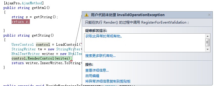 究其原因,原來是老趙的代碼 繼承了Page 然後使用VerifyRenderingInServerForm驗證,二我的代碼沒有繼承Page直接使用VerifyRenderingInServerForm 所以會造成