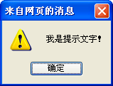 將上面部分代碼,用文本編輯器(如寫字板或其他更高級的編輯器,如 EditPlus 等)保存為 alert.html(或 alert.htm)。雙擊 alert.html 運行它(實際是使用 IE 等浏覽器打開這個文件),會看到如下彈出提示框: