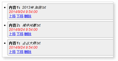 <ul class="clearfix"> <li class="courseList"> <div class="titDefault clearfix"> <div class="left clearfix"> <span class="dragBtn"></span><span class="tit">內容<em class="contIndex">1</em>:</span><em title="2013年 加班.txt" class="titDefaultName">2013年 加班.txt</em> </div> <div class="mid">2014/9/24 9:54:00</div> <div class="right clearfix"> <a value="253040" class="moveUpBtn" href="javascript:;"><span class="delTit">上移</span></a> <a value="253040" class="moveDownBtn" href="javascript:;"><span class="delTit">下移</span></a> <a value="253040" class="deleteBtn" href="javascript:;"><span class="delTit">刪除</span></a> </div> </div> </li> <li class="courseList"> <div class="titDefault clearfix"> <div class="left clearfix"> <span class="dragBtn"></span><span class="tit">內容<em class="contIndex">2</em>:</span><em title="使用說明.txt" class="titDefaultName">使用說明.txt</em> </div> <div class="mid">2014/9/24 9:54:00</div> <div class="right clearfix"> <a value="253041" class="moveUpBtn" href="javascript:;"><span class="delTit">上移</span></a> <a value="253041" class="moveDownBtn" href="javascript:;"><span class="delTit">下移</span></a> <a value="253041" class="deleteBtn" href="javascript:;"><span class="delTit">刪除</span></a> </div> </div> </li> <li class="courseList"> <div class="titDefault clearfix"> <div class="left clearfix"> <span class="dragBtn"></span><span class="tit">內容<em class="contIndex">3</em>:</span><em title="占占大師.txt" class="titDefaultName">占占大師.txt</em> </div> <div class="mid">2014/9/24 9:54:00</div> <div class="right clearfix"> <a value="253040" class="moveUpBtn" href="javascript:;"><span class="delTit">上移</span></a> <a value="253040" class="moveDownBtn" href="javascript:;"><span class="delTit">下移</span></a> <a value="253040" class="deleteBtn" href="javascript:;"><span class="delTit">刪除</span></a> </div> </div> </li> <li class="courseList"> <div class="titDefault clearfix"> <div class="left clearfix"> <span class="dragBtn"></span><span class="tit">內容<em class="contIndex">4</em>:</span><em title="排序問題.txt" class="titDefaultName">排序問題.txt</em> </div> <div class="mid">2014/9/24 9:54:00</div> <div class="right clearfix"> <a value="253041" class="moveUpBtn" href="javascript:;"><span class="delTit">上移</span></a> <a value="253041" class="moveDownBtn" href="javascript:;"><span class="delTit">下移</span></a> <a value="253041" class="deleteBtn" href="javascript:;"><span class="delTit">刪除</span></a> </div> </div> </li> </ul>