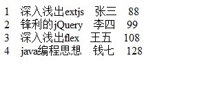 <?xml version="1.0" encoding="UTF-8"?> <root> <book id="1"> <name>深入淺出extjs</name> <author>張三</author> <price>88</price> </book> <book id="2"> <name>鋒利的jQuery</name> <author>李四</author> <price>99</price> </book> <book id="3"> <name>深入淺出flex</name> <author>王五</author> <price>108</price> </book> <book id="4"> <name>java編程思想</name> <author>錢七</author> <price>128</price> </book> </root>