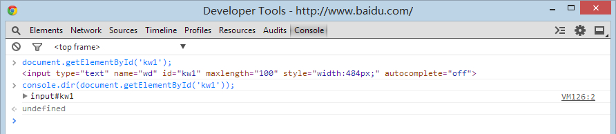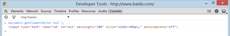 接著,我們輸入 document.getElementById('kw1'); 然後回車,就可以看到 id 為 kw1 的元素信息了。