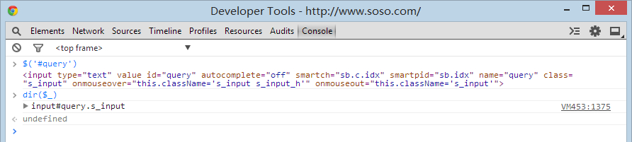 現在我們通過 $ 來查看 id 為 query 的元素(和百度的 kw1 元素一樣都是搜索框),然後查看該元素的屬性方法。
