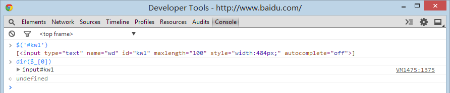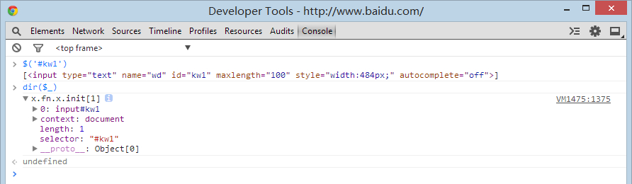 和剛才的有一點點不一樣,因為 $('#kw1') 這一步得到的是 jQuery 對象,所以我們dir出來的也是jQuery屬性方法。