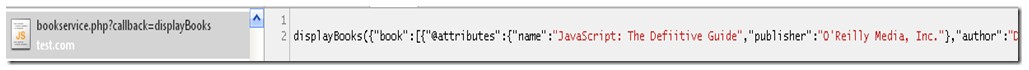 明顯JavaScript不能直接獲取books.xml,在test.com中需要有一個機制將xml轉化為json(這也就是為什麼叫jsonp,其實和ajax一樣,返回的數據不一定是json格式,只是json很好用),並動態拼接一條javascript調用語句返回,這個例子中直接使用php頁面拼接
