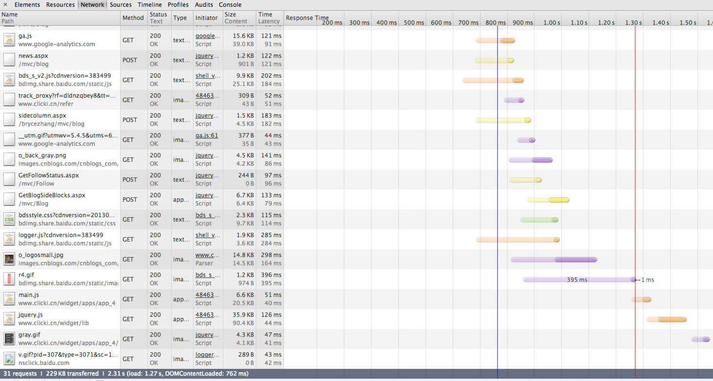 “合並腳本”。合並外部腳本文件,可以減少加載頁面時發送的請求次數。通過觀察Chrome開發者工具Network標簽,可以非常清楚的看到加載網頁的請求次數和時間,下圖為請求我的博客的情況,第三方的百度分享插件是最慢被加載的,當然整體加載時間還是可以接受的。不過當引用的文件過多過大,或者依賴的第三方插件請求緩慢時,整個頁面就會一直處於加載狀態,給人的感覺就是網頁加載緩慢,體驗就會變差。