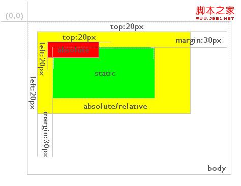 可以看到,紅色背景層依然定義top:20px;left:20px;但其相對的元素變為定位方式為absolute或relative的黃色背景層。因此,對於absolute定位的層總是相對於其最近的定義為absolute或relative的父層,而這個父層並不一定是其直接父層。如果其父層中都未定義absolute或relative,則其將相對body進行定位,如圖5: