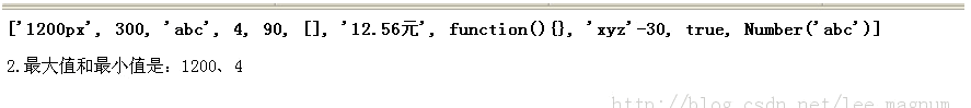<b>['1200px', 300, 'abc', 4, 90, [], '12.56元', function(){}, 'xyz'-30, true, Number('abc')]</b>