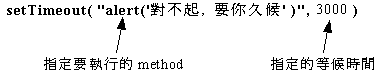 setTimeout( )是設定一個指定等候時間 (單位是千分之一秒, millisecond), 時間到了, 浏覽器就會執行一個指定的 method 或 function, 有以下語法: