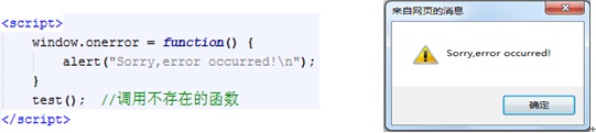 onerror事件用來協助處理頁面中的JavaScript錯誤。當頁面上出現異常時,error事件便在window對象上觸發。例如: