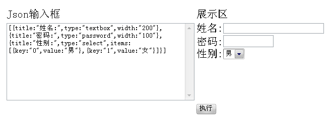 在左側輸入框中輸入Json串,點擊執行時根據輸入的Json串在右側展示區顯示出相應的Html(使用Jquery1.4.4)