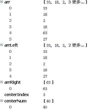 這是第一次執行函數的變量情況:中間數是40;根據循環裡的判斷條件小於40的存放在arrLeft,大於40的存放在arrRight裡面。如下圖