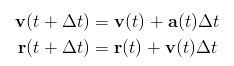 在計算機模擬中,通常需要計算連續的物體狀態。用游戲的用語,就是計算第一幀的狀態、第二幀的狀態等等。設物體在任意時間t的狀態:位置矢量為、速度矢量為、加速度矢量為。我們希望從時間的狀態,計算下一個模擬時間的狀態。最簡單的方法,是采用歐拉方法(Euler method)作數值積分(numerical integration):