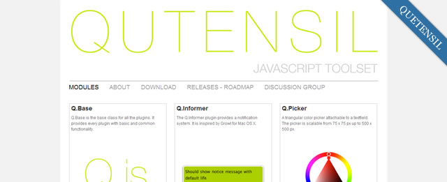 Qutensil 仍在開發中,但其路線圖已經顯示出某些引人注目的東西,基於 Prototype 與 Scriptaculous ,包含消息,調色板,滑動條,工具提示,可拖放窗口以及警告,確認,提示等窗口。