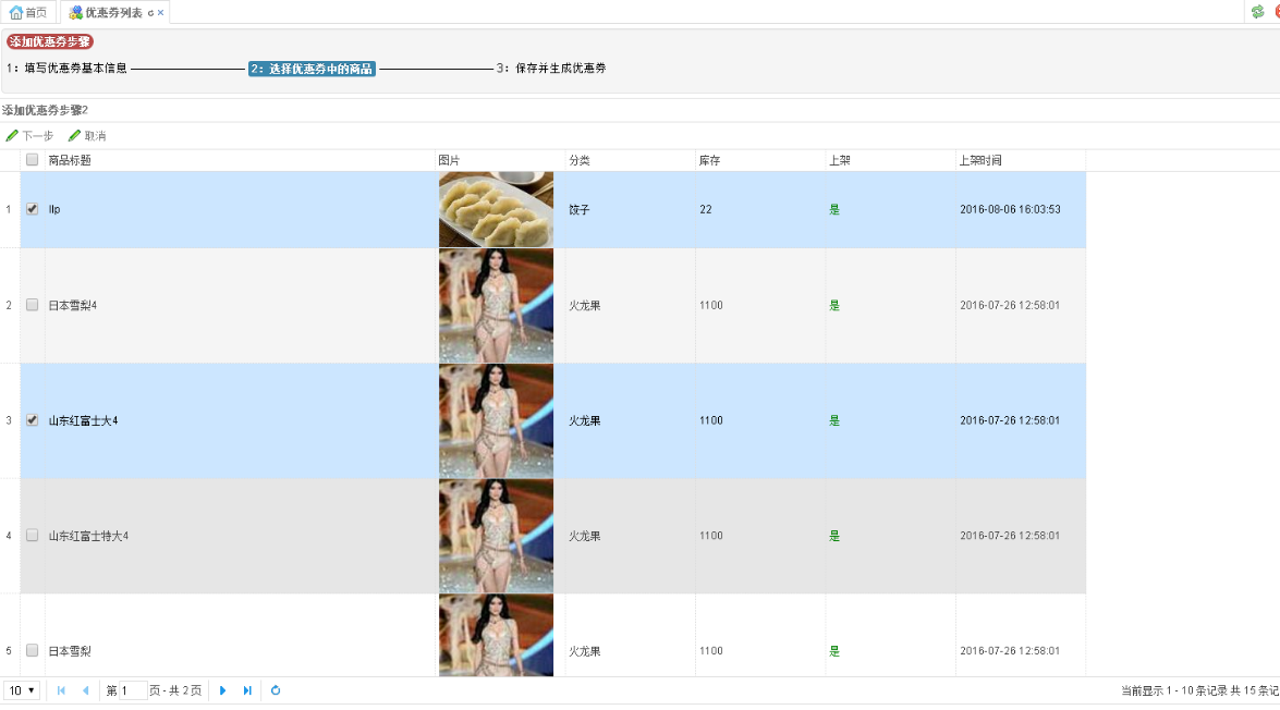 1:填寫優惠券基本信息 —————————— <span class="label-info"><strong>2:選擇優惠券中的商品</strong></span> —————————— 3:保存並生成優惠券