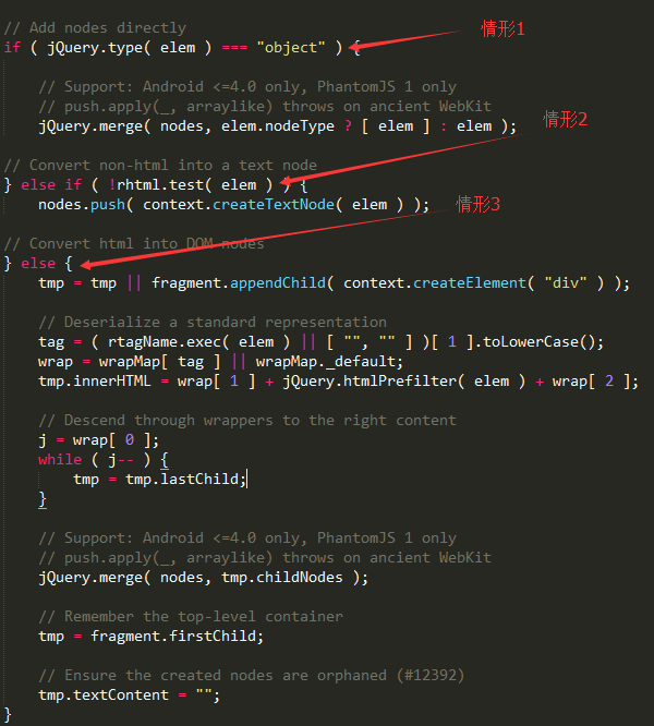 2. scripts 參數只在 jQuery.parseHTML 方法裡使用(domManip裡傳false),當 jQuery.parseHTML 的第三個參數 keepScripts 為 false 時將刪除節點裡所有的 script tag