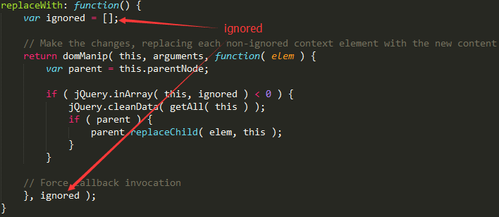 1. 最後兩個參數 selection 和 ignored 只在 replaceWith 方法裡使用。需要了解的是 replaceWith 只做節點替換,不會替換先前元素的所有數據(Data),比如綁定事件,$.data 都不會被新元素擁有。