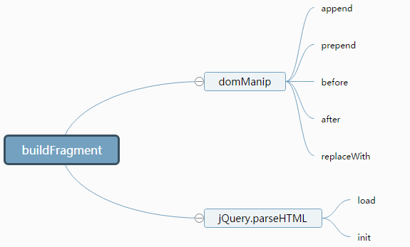 jQuery3.0 中 buildFragment 只在 domManip 和 jQuery.parseHTML 中使用,domManip 則被 DOM 操作如 append、prepend、before、after 等方法的所依賴。