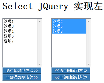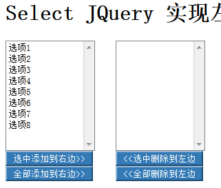 <body> <h1>Select JQuery 實現左右復制移動內容</h1> <div style="width:500px;"> <div class="centent" style="float:left;"> <select multiple="multiple" id="select1" style="width:130px;height:160px;"> <option value="1">選項1</option> <option value="2">選項2</option> <option value="3">選項3</option> <option value="4">選項4</option> <option value="5">選項5</option> <option value="6">選項6</option> <option value="7">選項7</option> <option value="8">選項8</option> </select> <div> <button id="add" >選中添加到右邊>></button><br> <button id="add_all" >全部添加到右邊>></button> </div> </div> <div class="centent" style="padding-left:160px;"> <select multiple="multiple" id="select2" style="width: 130px;height:160px;"> </select> <div> <button id="remove"><<選中刪除到左邊</button><br> <button id="remove_all"><<全部刪除到左邊</button> </div> </div> </div> </body>
