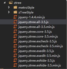 •js文件:zTree.all.js是完整的js庫,可單純加載此文件實現所有zTree功能,ztree.core、ztree.excheck、ztree.exedit、ztree.exhide是對ztree按照功能進行的分割,分別對應基本功能、復選功能、編輯功能、顯隱功能。