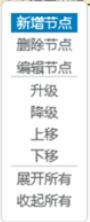 <div id="rMenu" style="z-index:100;"> <ul> <li id="m_add" onclick="addTreeNode();">新增節點</li> <li id="m_del" onclick="removeTreeNode();">刪除節點</li> <li id="m_edit" onclick="editTreeNode();" style="border-bottom:1px solid #cecece">編輯節點</li><li id="m_left">升級</li> <li id="m_right">降級</li> <li id="m_up">上移</li> <li id="m_down" style="border-bottom:1px solid #cecece">下移</li> <li id="m_reset" onclick="resetTree();">重置節點</li> <li id="m_open" onclick="treeOpen()">展開所有</li> <li id="m_stop" onclick="treeStop()">收起所有</li> </ul> </div>