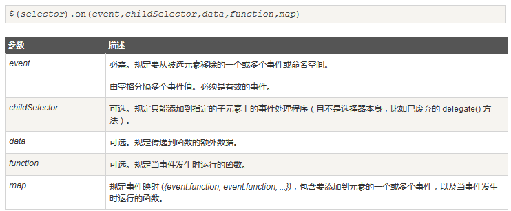 注意:使用 on() 方法添加的事件處理程序適用於當前及未來的元素(比如由腳本創建的新元素)。
